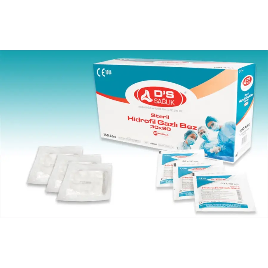 DS 30×80 hidrofil gazlı bez, yara bakımı ve cerrahi operasyonlarda kullanılan, yüksek emiciliğe sahip steril bir medikal malzemedir. Genellikle 30×80 cm boyutunda bir alanı kaplayacak şekilde tasarlanmıştır.